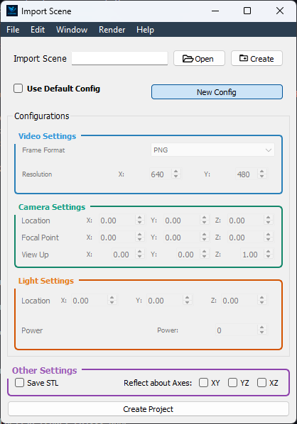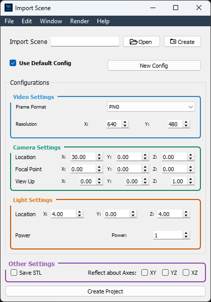 To add a model to the scene, click the Create button under the Import Scene section. This opens the Scene Creator Window.