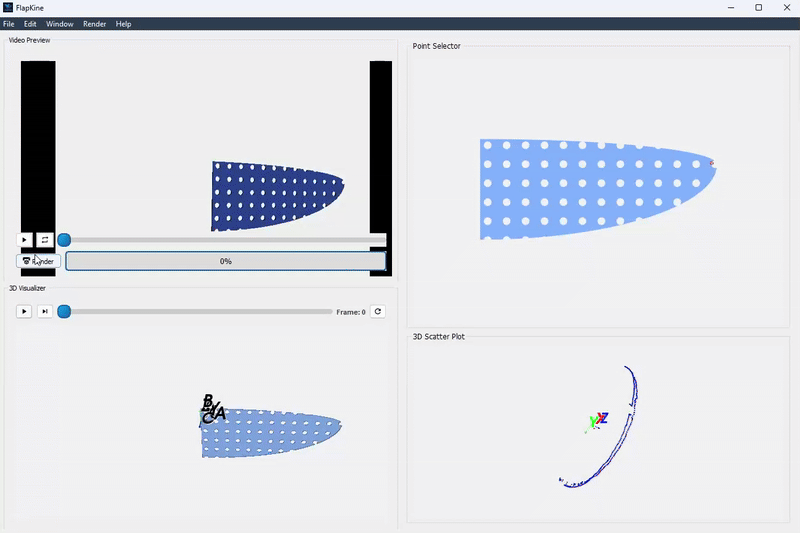 At present, we use DLTdv [1] to process video recordings and generate 3D positional data. FlapKine then takes this data as input and computes a time series of Euler angles needed to recreate the wing motion through inverse kinematics.