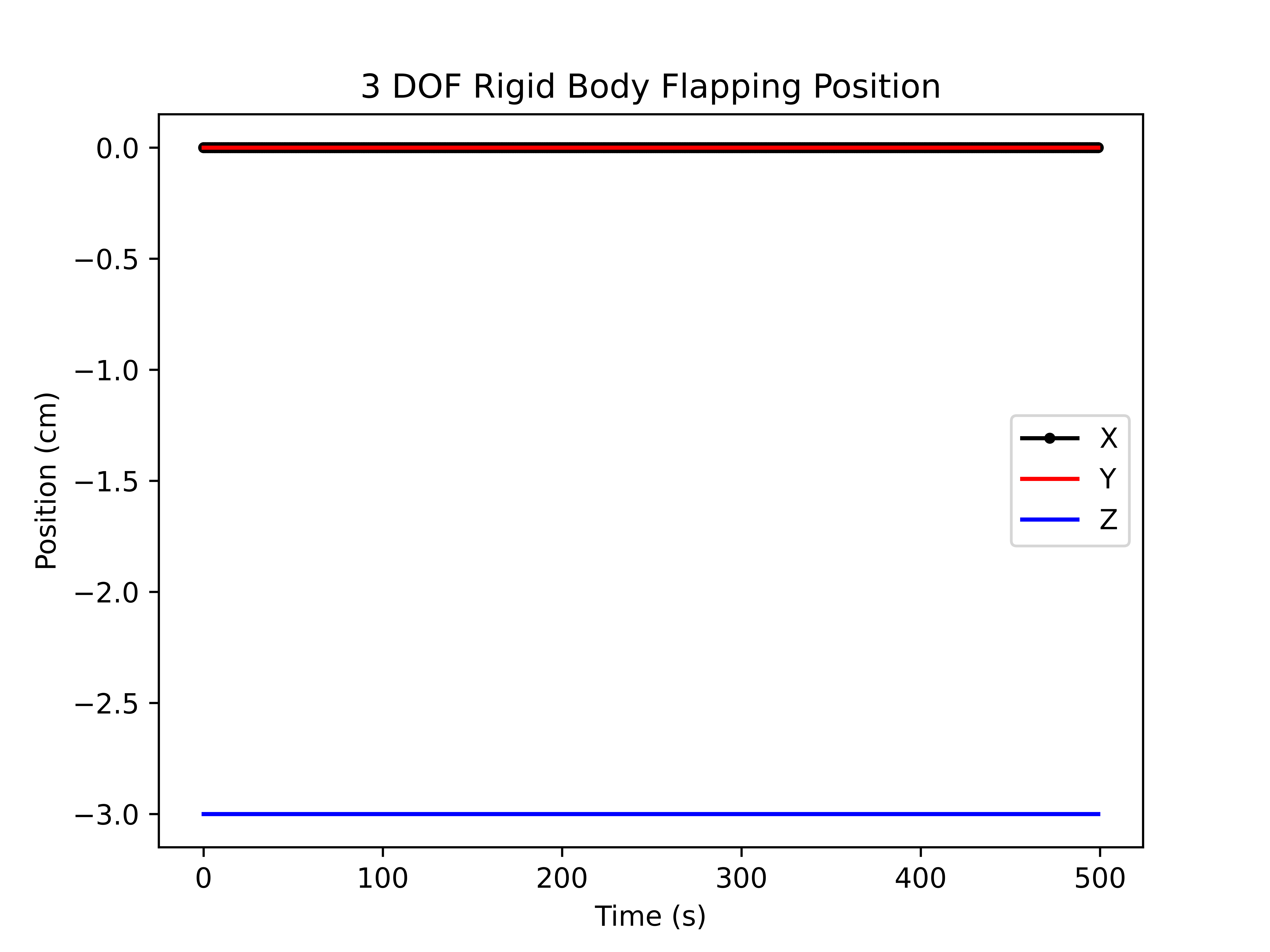 Figure: Time-series plot of the translational positions (X, Y, and Z) of the body frame origin. The constant values reflect the static positional offset applied throughout the simulation.#