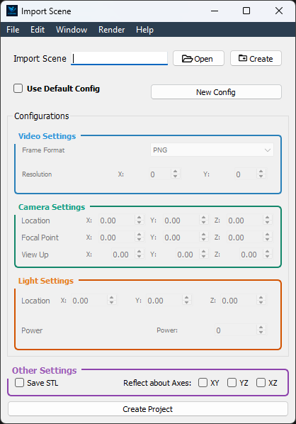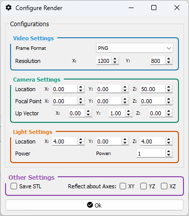 The Render Settings Window allows you to configure all rendering parameters, including video output, camera setup, lighting, STL export, and reflection settings.